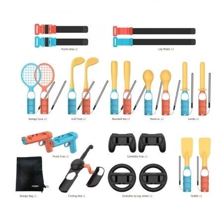 - Contenu du kit : Tennis rackets 2 pcs, Golf clubs 2 pcs, Baseball bat 2 pcs, Kendo 2 pcs, Propeller 2 pcs, Sand hammer 2 pcs, Fishing rod 1 pcs, Regular grip 2 pcs, Steering wheel 2 pcs, Hand strap 2 pcs, Leg straps 2 pcs, Short gun 2 pcs, Bag 1 pcs.